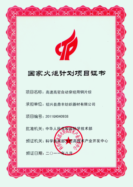 浙江鼎豐紡織器材有限公司始建于1986年,是一家專業(yè)生產各類無梭織機用鋼筘:噴氣筘、噴水筘、劍桿筘、其他類型鋼筘;鋁合金綜框、鋼片綜、停經(jīng)片、經(jīng)軸、織軸、卷布輥等產品及配件的民營企業(yè)。